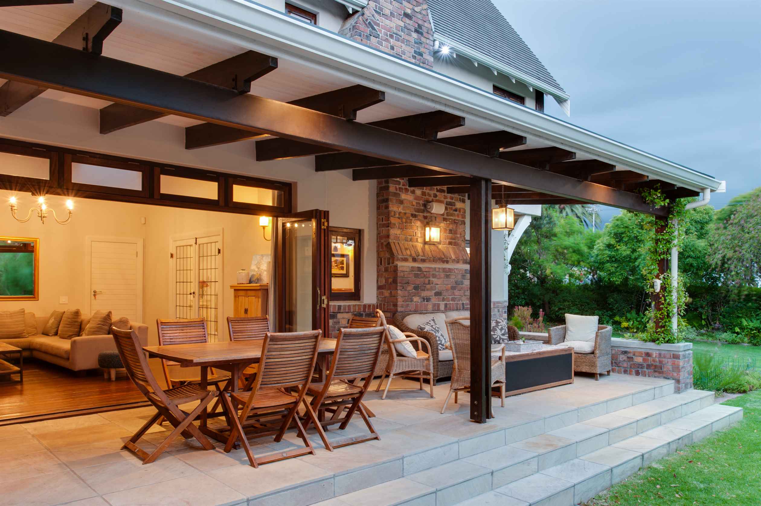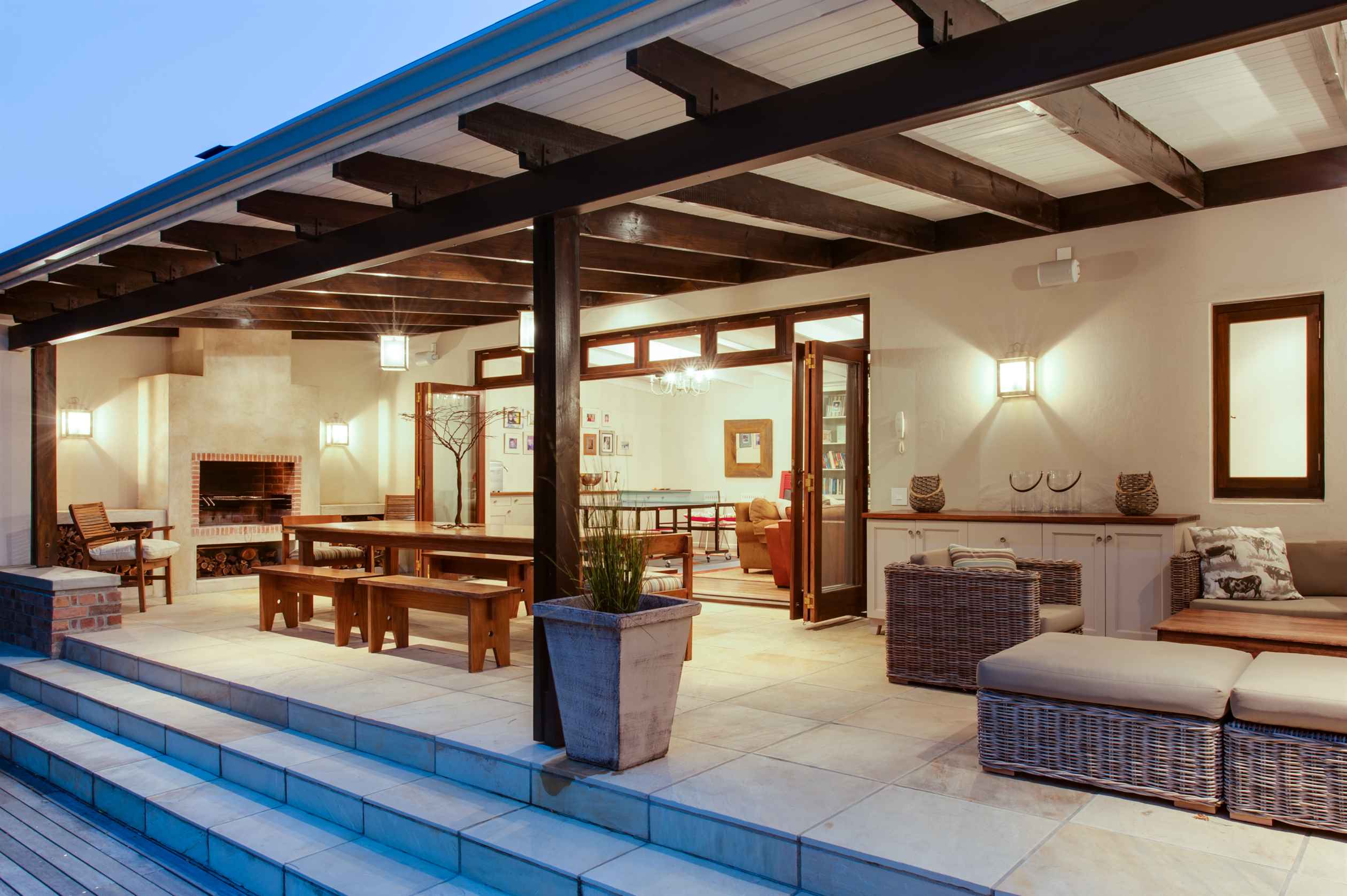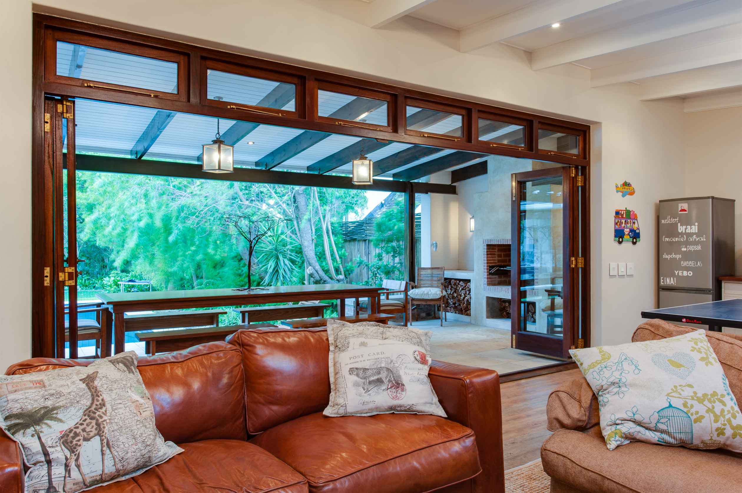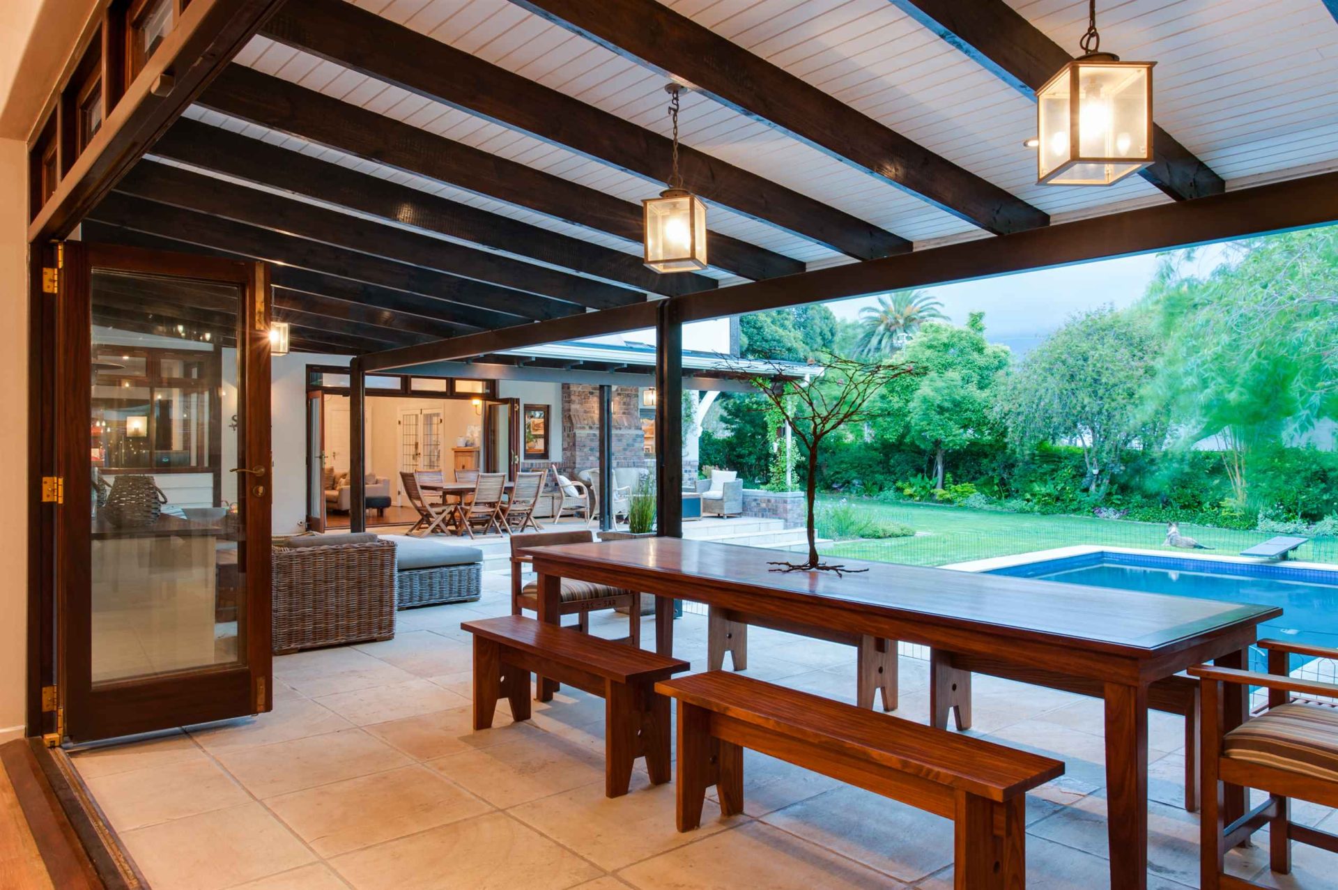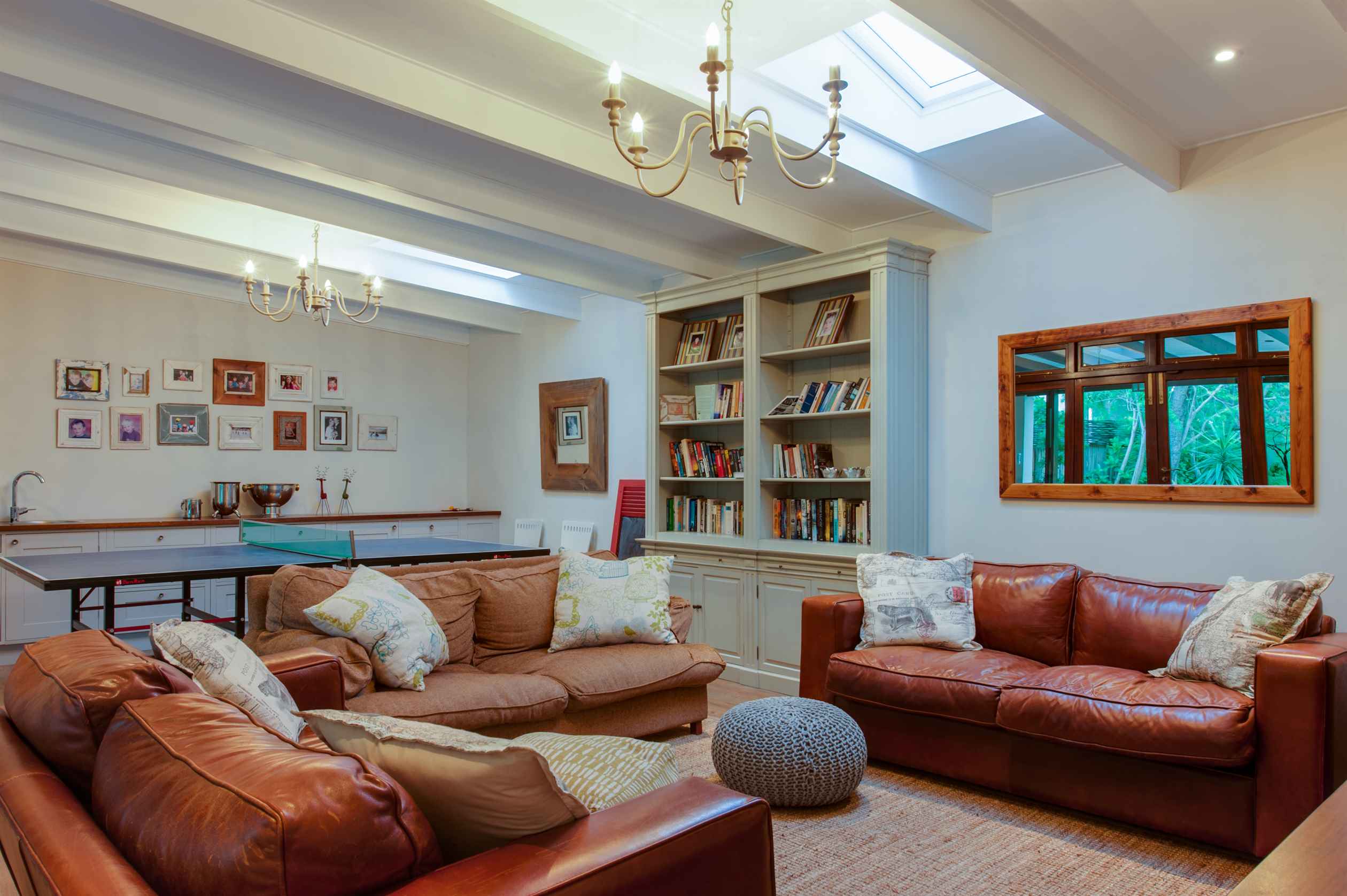 The wrap around veranda ends with the new braai, which holds a commanding position looking over the sun drenched pool and garden with views of the Kirstenbosch buttresses beyond. The loss of light that comes with a deep veranda attached to a deep playroom was alleviated by adding skylights.