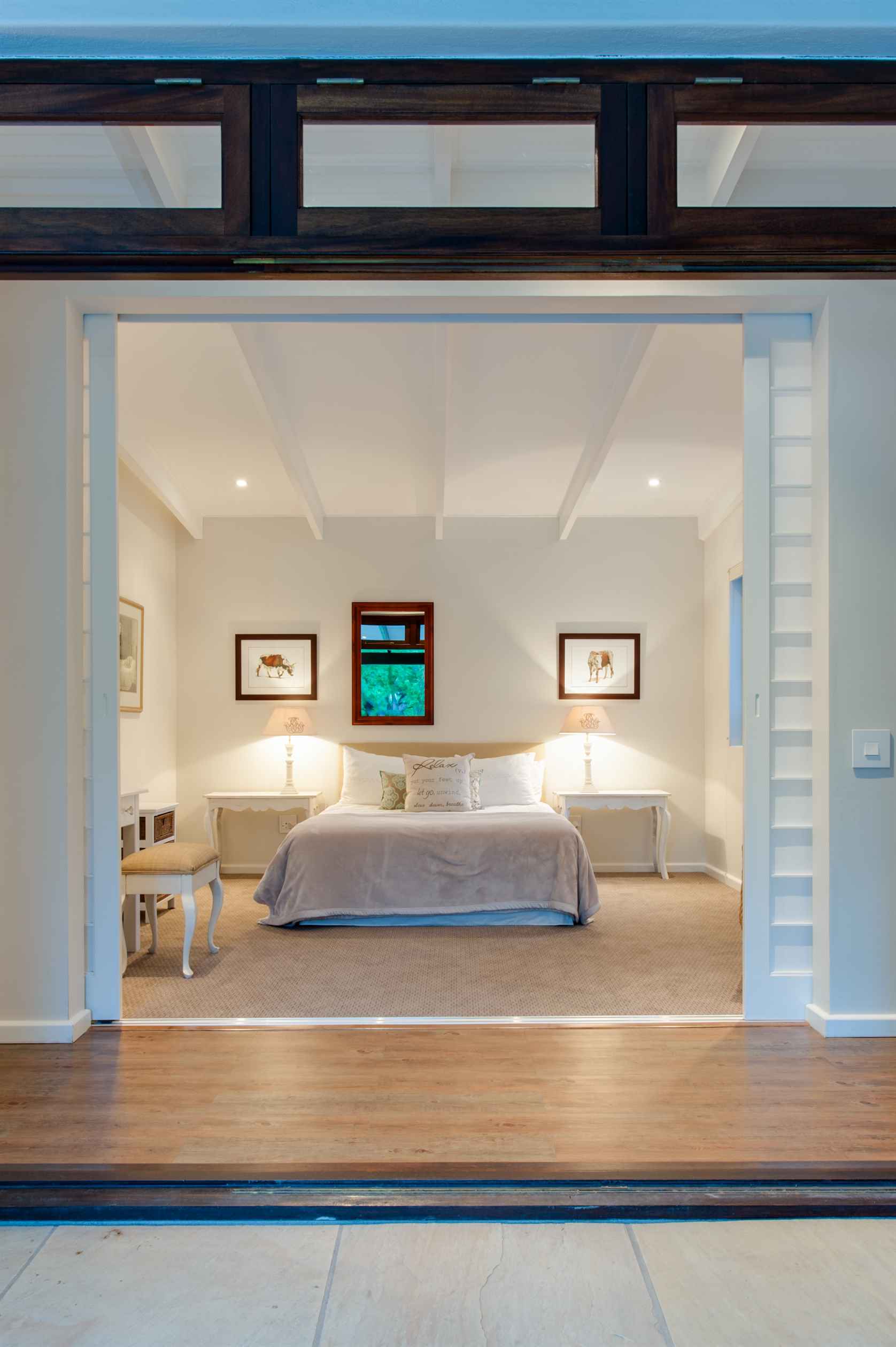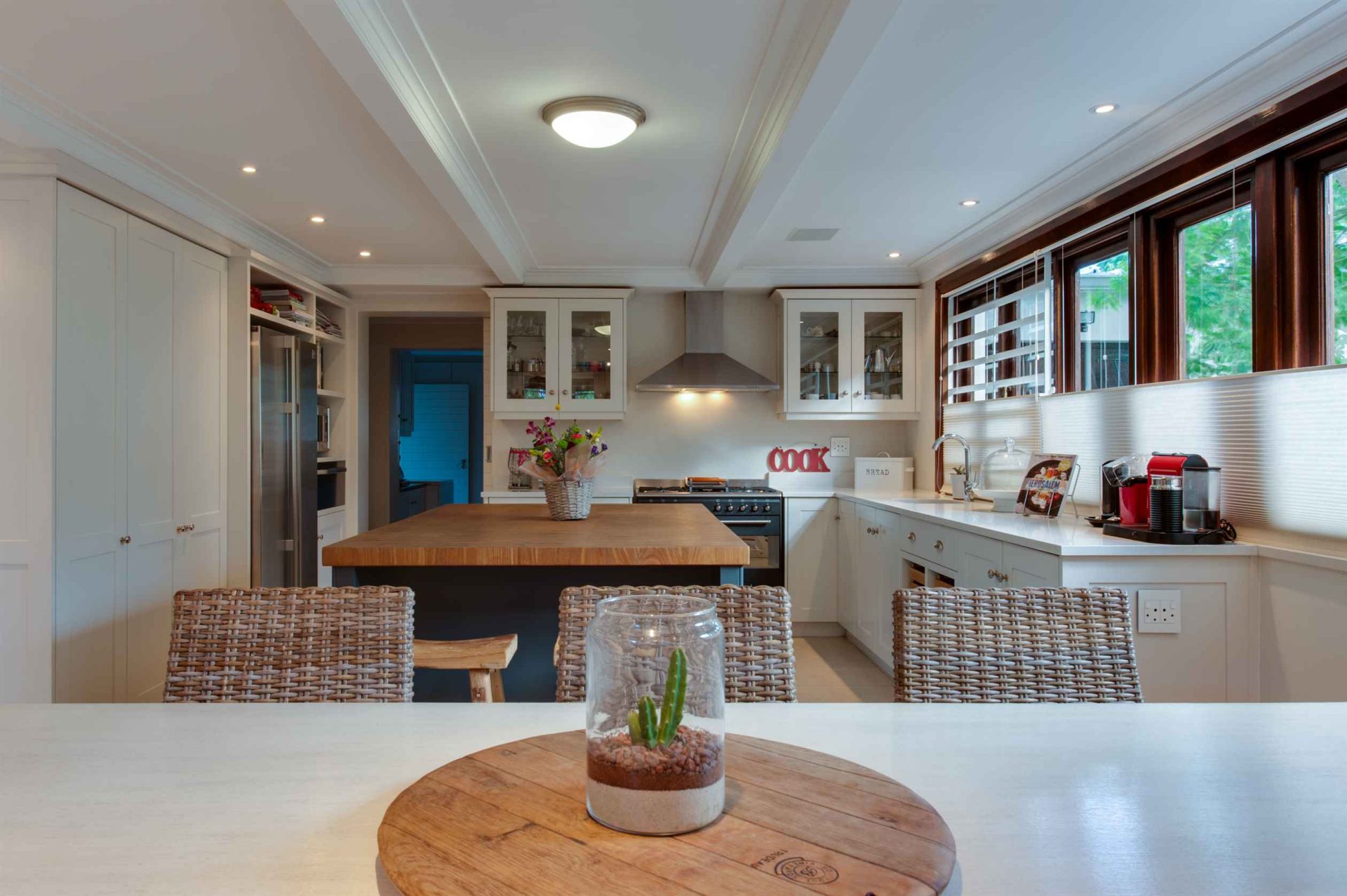 The visitor’s entrance sequence was restored to a classical access path on one side of the north facing games lawn with service entrance via the new garage. The Entrance hall was pushed out and the new front door was set within a glazed frame to create a more generous light filled hall. The kitchen was modernized and opened up to incorporate the snug TV lounge. The old formal lounge was revived through opening it up to the new entrance hall and restoring the old hearth, illuminating it with discreet new skylights on either side of the chimney breast. A new wing housing the playroom and guest suite was built hard up on the South boundary to engage the old pool and maximize the garden. A new deep wrap-around veranda replaces the old small canopies to form a garden-pool court and the big old pool was given a new classical shape and coping and connects to the new veranda terrace via a deck. To the kids delight, the old diving board was refurbished!